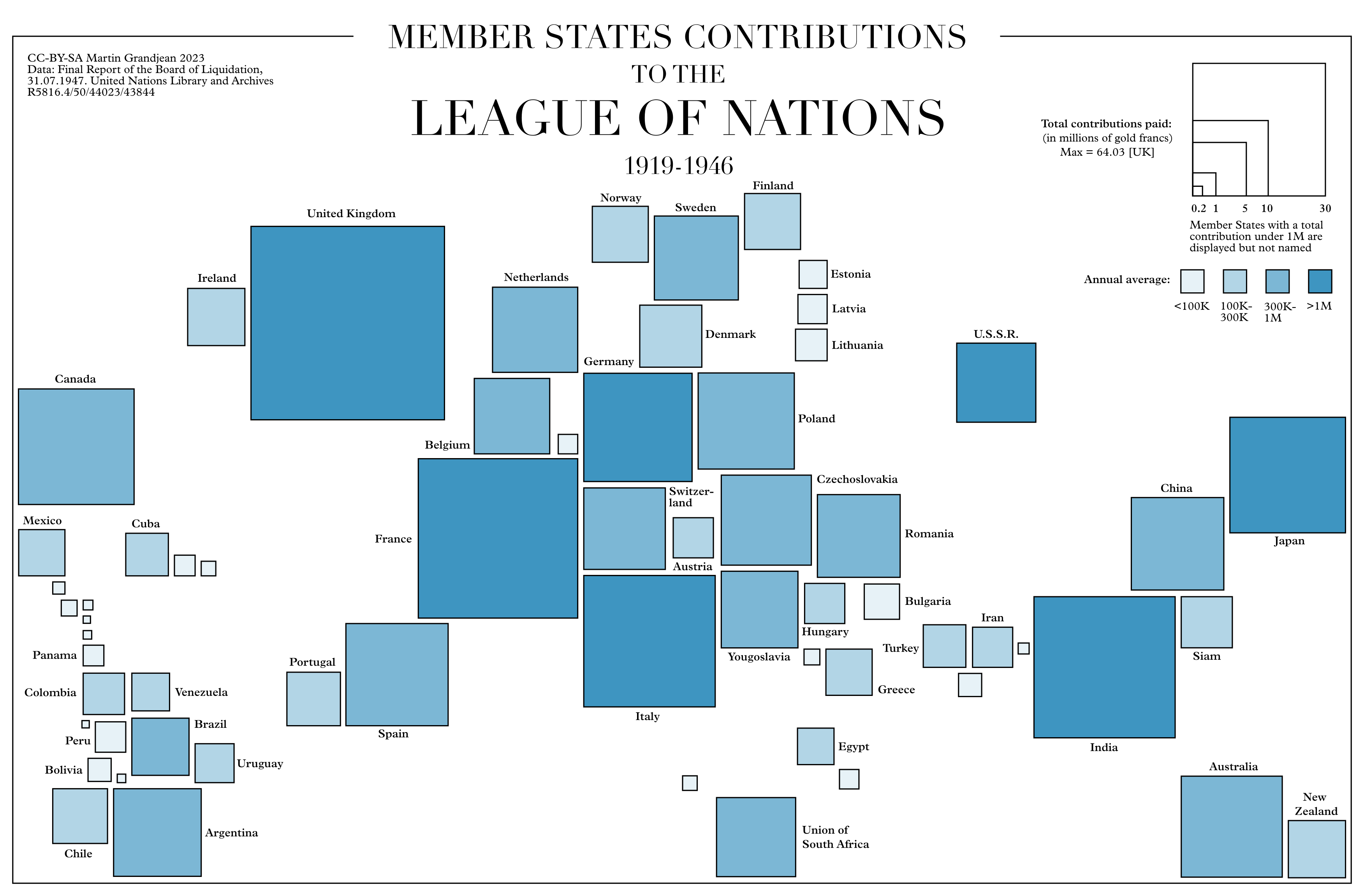 In the map above, the size of the squares is proportional to the total contribution, while the color gives an indication of the size of the annual contribution. The distinction is important because comparing the total does not take into account the fact that not all states have been members for the same amount of time. Some joined the League of Nations later, such as Turkey, Ethiopia or Finland. Some founding members left the organization, like Brazil, Japan or Italy. And others joined later and left earlier, like Germany or the USSR. Note that not all states were good payers, which means that this is the average of what they actually paid, not the amount they were theoretically expected to pay each year.